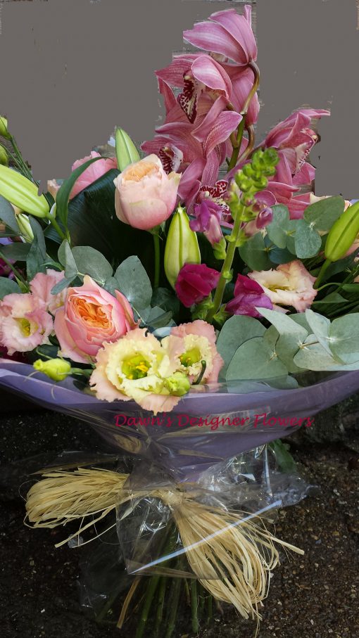 Pink and green – This hand tied birthday flower bouquet made up of  Roses, Lisianthum, Alstromeria, Orchids, Lilies, Chrysanthemums and finished with mixed foliage.