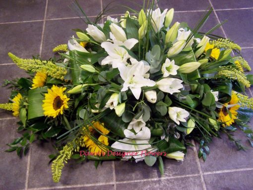 Casket Spray from Sunflowers and Lilies, available in other colours.