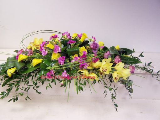 This lavish Coffin Top was created using pink freezia and yellow orchids, calla lilies, and finished with aspidistra leaves, eucalyptus and salal leaves.