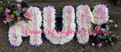 These funeral tributes can be referred to as name, word, letter frame tributes and can be made to spell any word or numbers for a date or age, for example. The most traditional Funeral letter tribute is for Mum, Dad, Nan, Grandad, Gran, Sister, Auntie (aunty), Cousin, Nephew, Brother, Uncle, Grandma, Grandpa. We offer a wide range of styles, alternatively contact us to discuss other idea you may have.