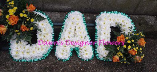 These funeral letter tributes are covered using fluffy white chrysanthemum flowers with a ribbon edge and lovely clusters of seasonal flowers. This is the most popular and traditional choice. You can choose from any color ribbon, the chrysanthemums are available in white (as shown), yellow, dusky or bright pink, green. The clusters of flowers can be a mixture of any colours of your choice.