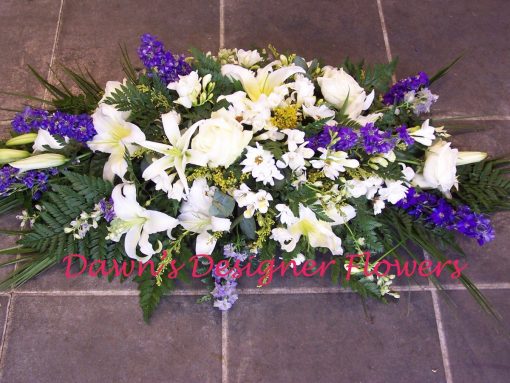 A beautiful double ended Funeral spray in fresh white and blue flowers.