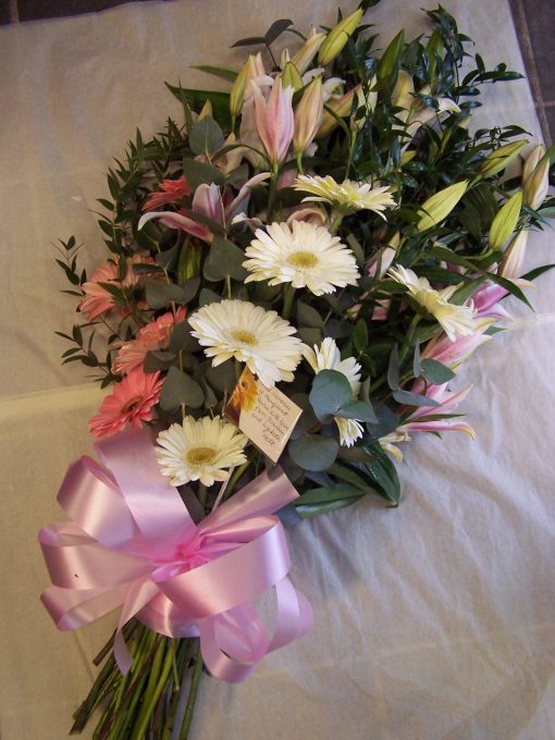 Open tied  sheaf of mixed flowers and foliages, any colours can be used. Suitable for a funeral or as a memorial for your loved one, these designs are larger than the more traditional flowers in cellophane.